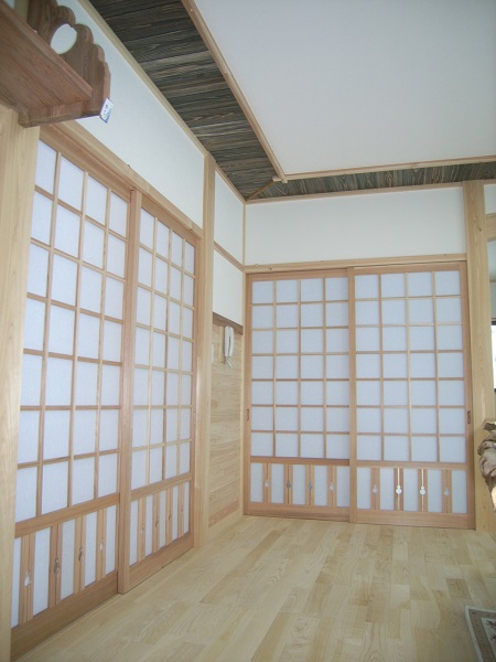 上棟後、タルキという屋根下地を打ち付けるのですが(屋根の勾配なりに斜めに架かる材木)、見上げれば組上がった材木の間から、青空が見えます。